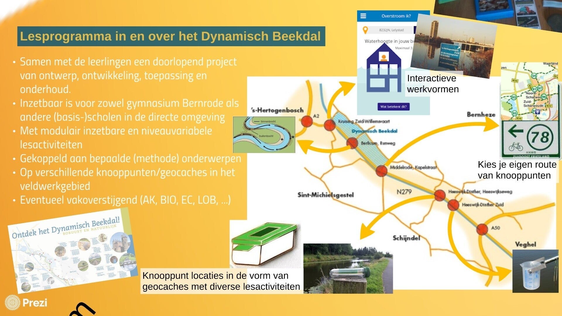 Het lesprogramma bestaat uit meerdere excursiepunten die afzonderlijk en in eigen volgorde bezocht en ontdekt kunnen worden. Bij ieder excursiepunt is specifieke informatie beschikbaar en zijn één of meerdere opdrachten te maken. Er is een onderverdeling gemaakt naar vakgerichte onderwerpen, zoals biologie/natuur, geschiedenis en aardrijkskunde. Deze kunnen waar gewenst worden ingezet als aanvulling op gebruikte methodelessen in de klas. Dit veldwerk heeft als doel om wat in de klas is geleerd in de praktijk te herkennen. De behandelde stof in de klas wordt op die manier meer betekenisvol voor de leerlingen, wat motiverend en stimulerend werkt voor de leerlingen. Zodoende wordt betrokkenheid bij het onderwerp vergroot, wordt de stof beter verwerkt en wordt kennis en kunde beter verankerd.