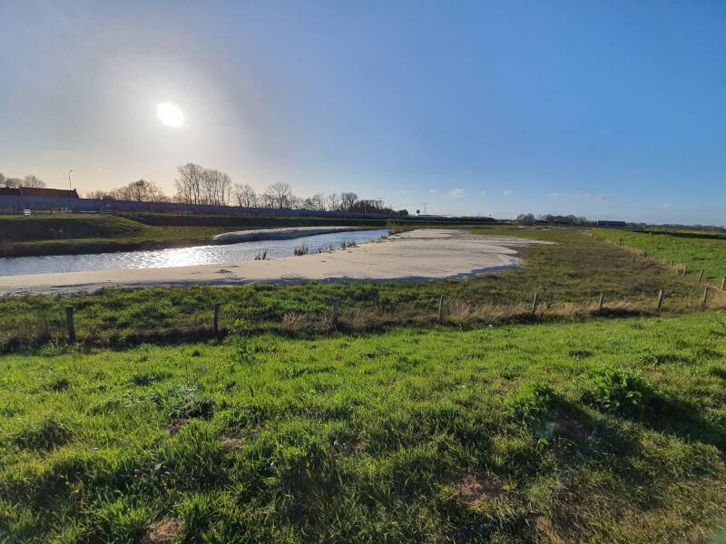 In de binnenbocht, want daar stroomt het water langzaam en zakken zand en klei naar de bodem en vormt zo een zandbankje. In de buitenbocht schuurt het water juist zand weg. Zo worden de buitenbochten steeds groter en gaat de rivier steeds meer kronkelen.
